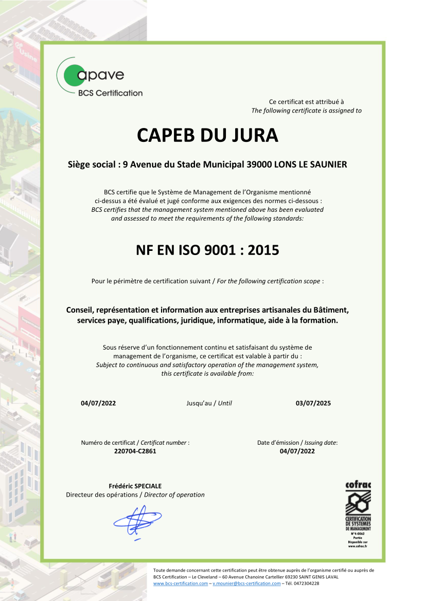 Après une première période de certification de 3 ans, la CAPEB Jura a obtenu à nouveau la certification ISO 9001. Seule Organisation professionnelle départementale du BTP à être certifiée, notre organisation professionnelle, ses élus et ses collaborateurs s'engagent dans une démarche d'amélioration continue au service de toutes les parties prenantes et particulièrement ses adhérents.
