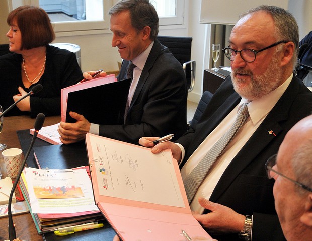 Patrick Liébus, Président de la CAPEB, Françoise Despret, Présidente de la CNATP, Jean-Jacques Châtelain, Trésorier de l’IRIS-ST et Paul Duphil, Secrétaire Général de l’OPPBTP, renouvellent leur collaboration en faveur d’une meilleure prévention des risques professionnels dans l’artisanat du Bâtiment.