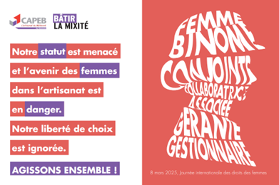Face à cette injustice, la CAPEB lance un appel urgent aux pouvoirs publics pour qu'ils reviennent sur cette mesure et préservent le statut de conjoint collaborateur au-delà du 31 décembre 2026. Les femmes de l’artisanat du bâtiment doivent pouvoir choisir librement leur statut, dans le respect de leur rôle et de leur engagement au sein de l’entreprise artisanale.