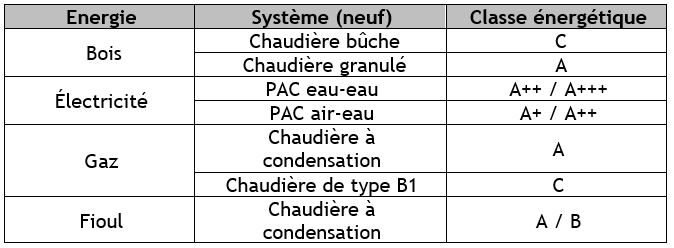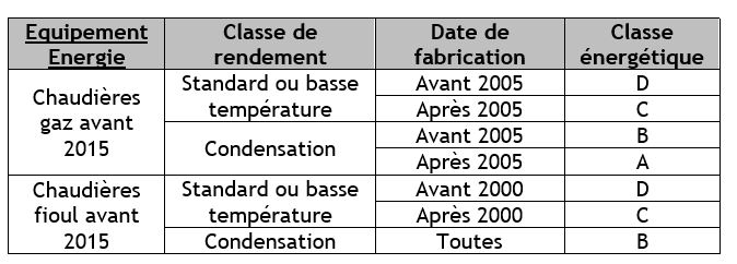 Le tableau suivant qui synthétise la classe énergétique des principales solutions de remplacement devra également apparaître sur l’attestation d’entretien.