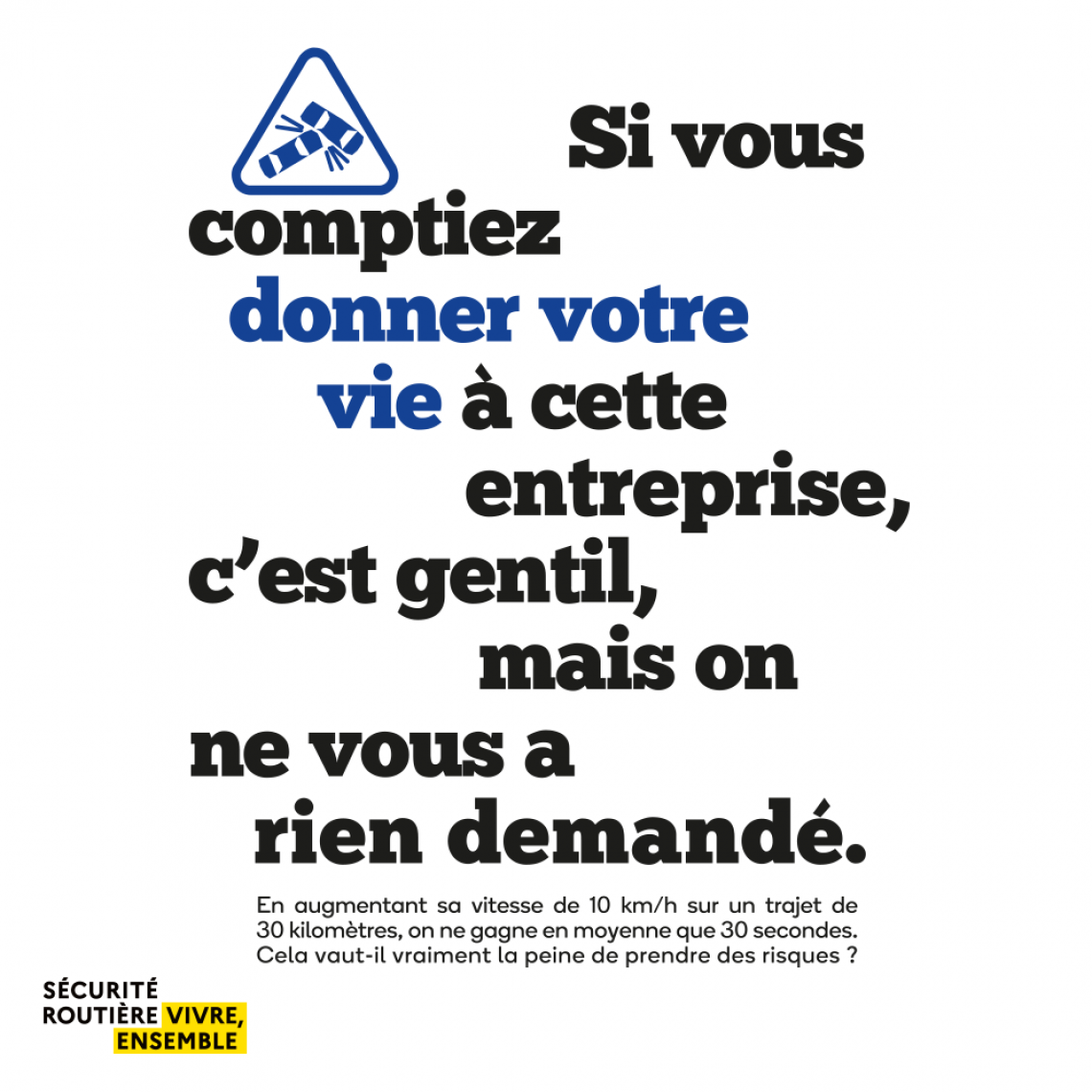 Retrouvez sur securite-routiere.gouv.fr de nombreux outils de sensibilisation au risque routier (affiches à imprimer, phrases chocs...) et des exemples d’initiatives pour rendre la route plus sûre.