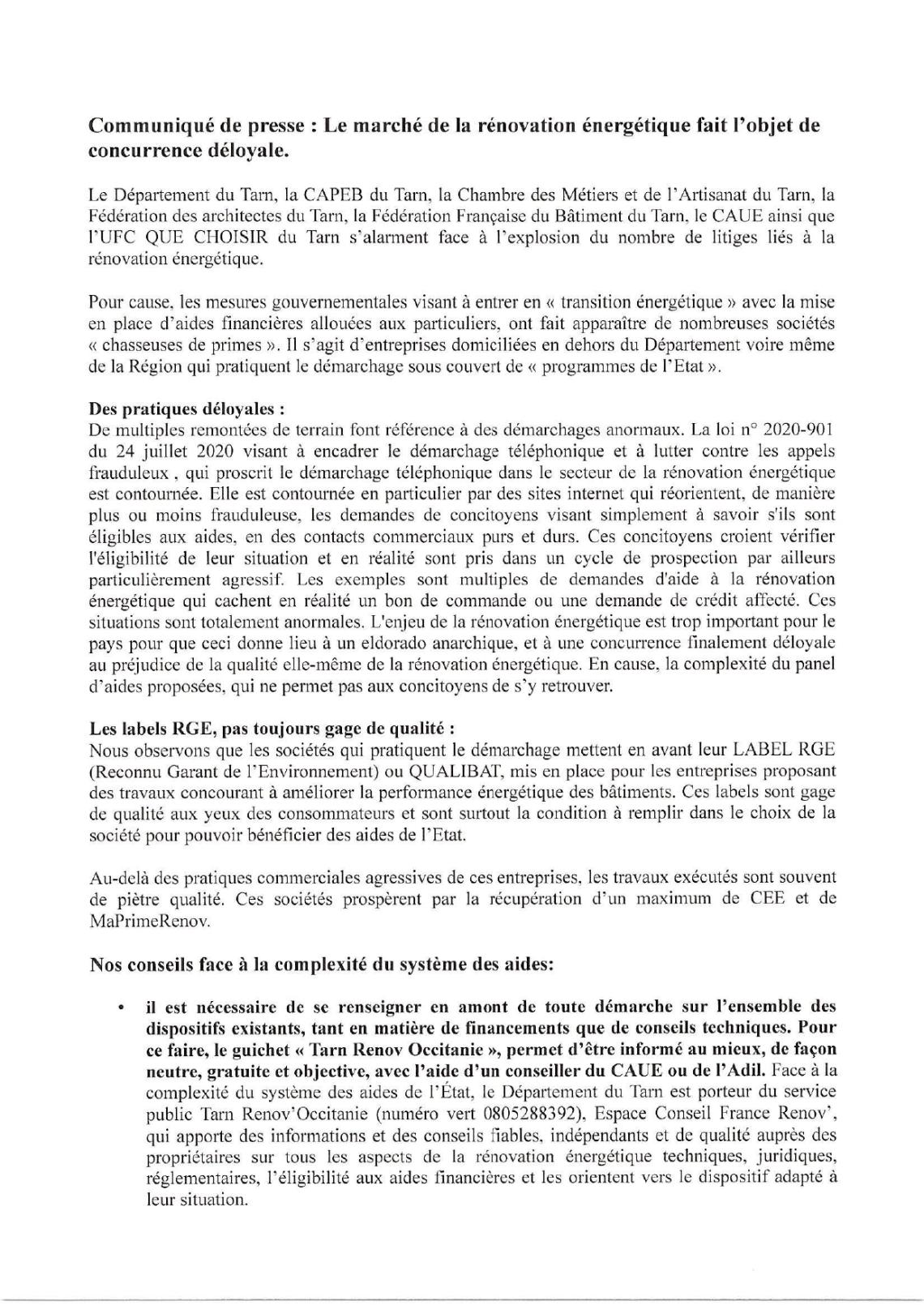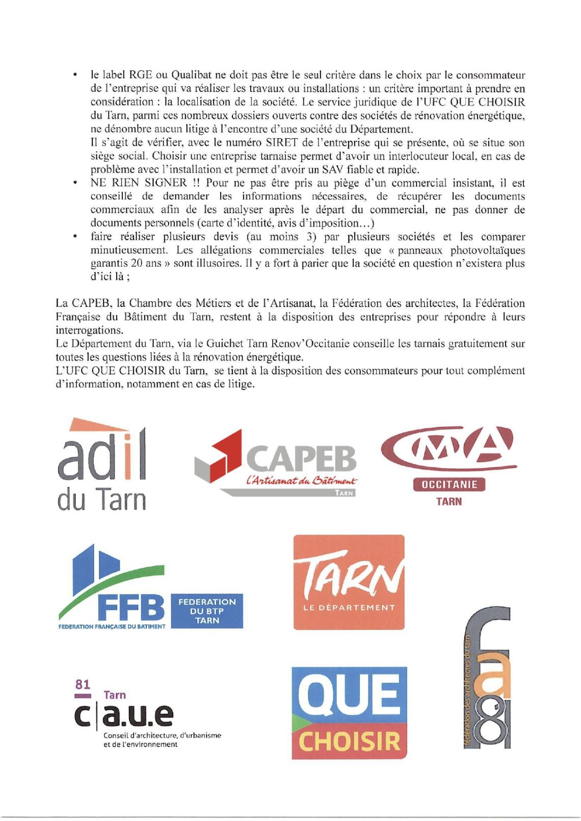 Le Département du Tarn, la CAPEB du Tarn, la Chambre des Métiers et de 1’Artisanat du Tarn, la Fédération des architectes du Tarn, la Fédération Française du Bâtiment du Tarn, le CAUE ainsi que l'UFC QUE CHOISIR du Tarn s’alarment face à l'explosion du nombre de litiges liés à la rénovation énergétique.