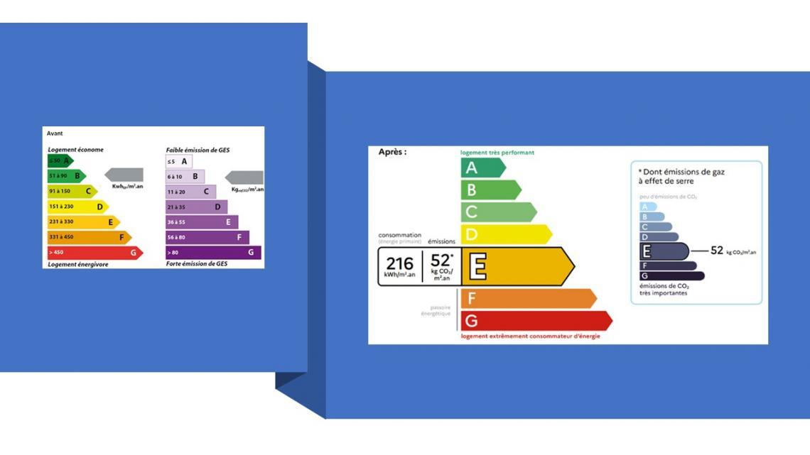 Le nouveau DPE comporte une nouvelle étiquette (de A à G) intégrant deux volets : la consommation énergétique (kilowattheure d’énergie primaire par m2 par an) et les émissions de gaz à effet de serre (kilogramme équivalent de CO2 par m2 par an).