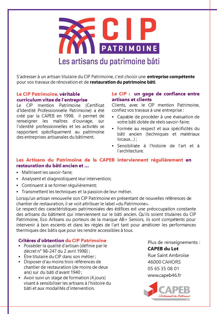 Le CIP mention Patrimoine (Certificat d’Identité Professionnelle Patrimoine) a été créé par la CAPEB en 1998. il permet de renseigner les maîtres d’ouvrage, sur l’identité professionnelles et les activités se rap-portant spécifiquement au patrimoine des entre-prises artisanales du bâtiment.