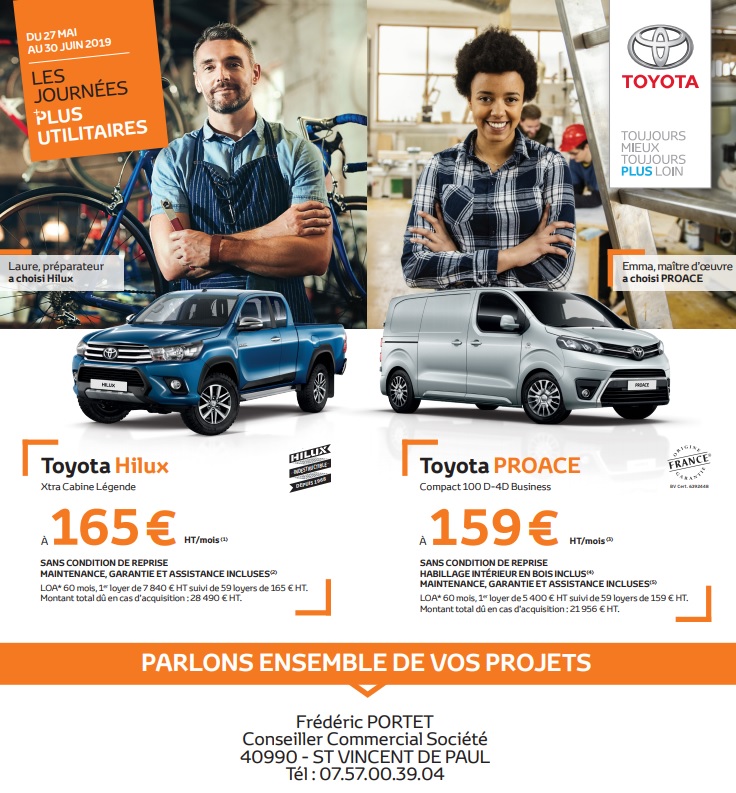 Du 17 mai au 30 juin 2019, découvrez les offres attractives de notre partenaire Toyota dans le cadre des journées Plus Utilitaires.