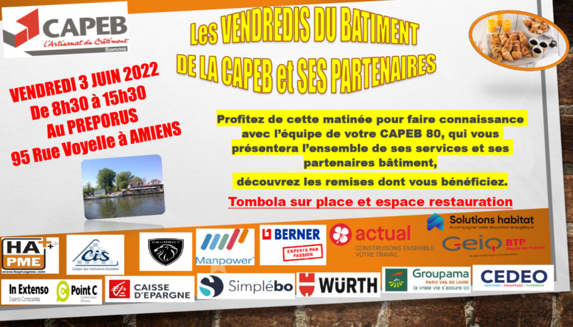 Les VENDREDIS DU BATIMENT DE LA CAPEB et SES PARTENAIRES : LE 03 JUIN 2022 DE 8H30 A 15H30