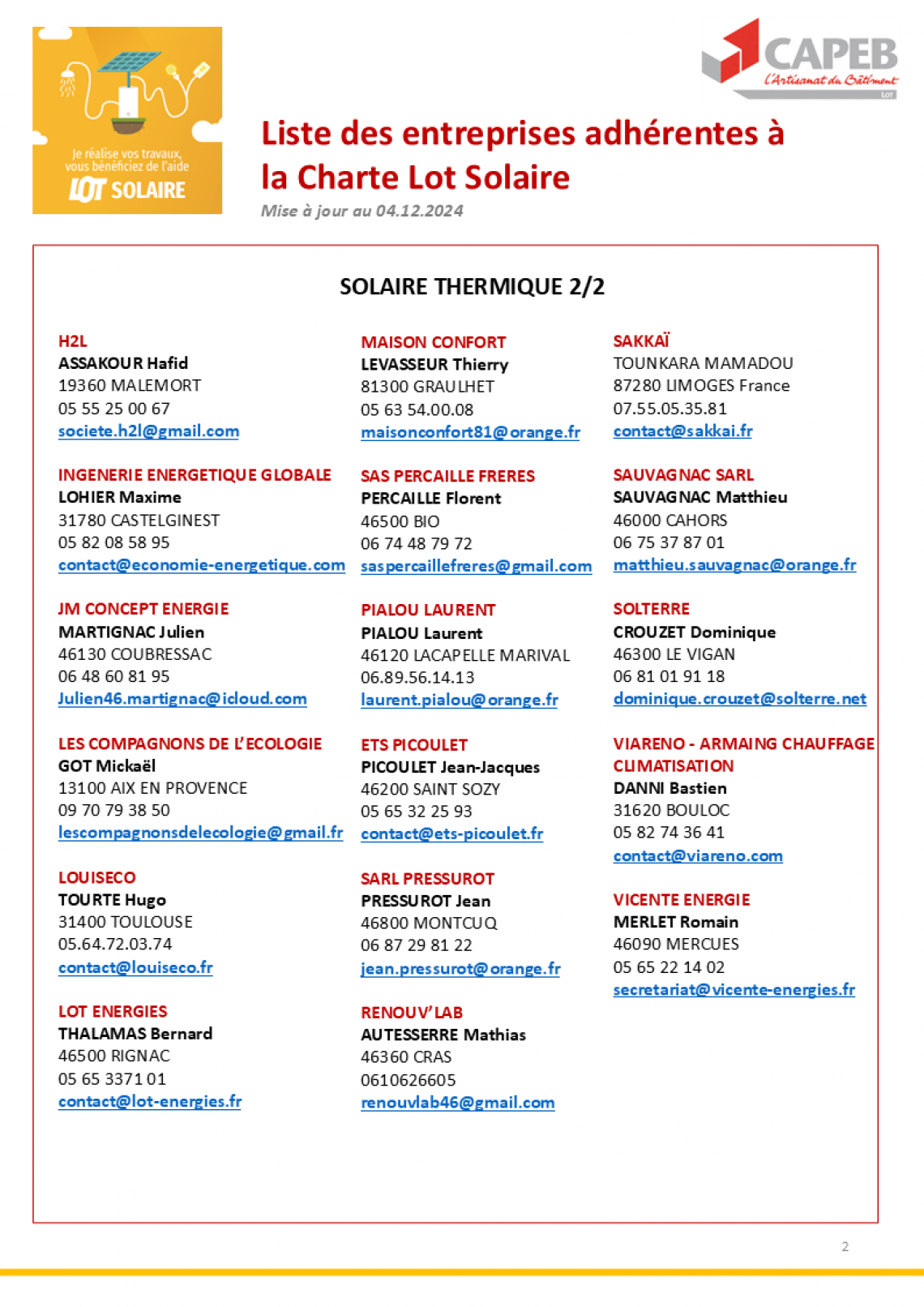 Pour plus d'information sur les formations ou l'adhésion à la Charte Lot Solaire, n'hésitez pas à contacter la CAPEB du Lot au 05 65 35 08 01.