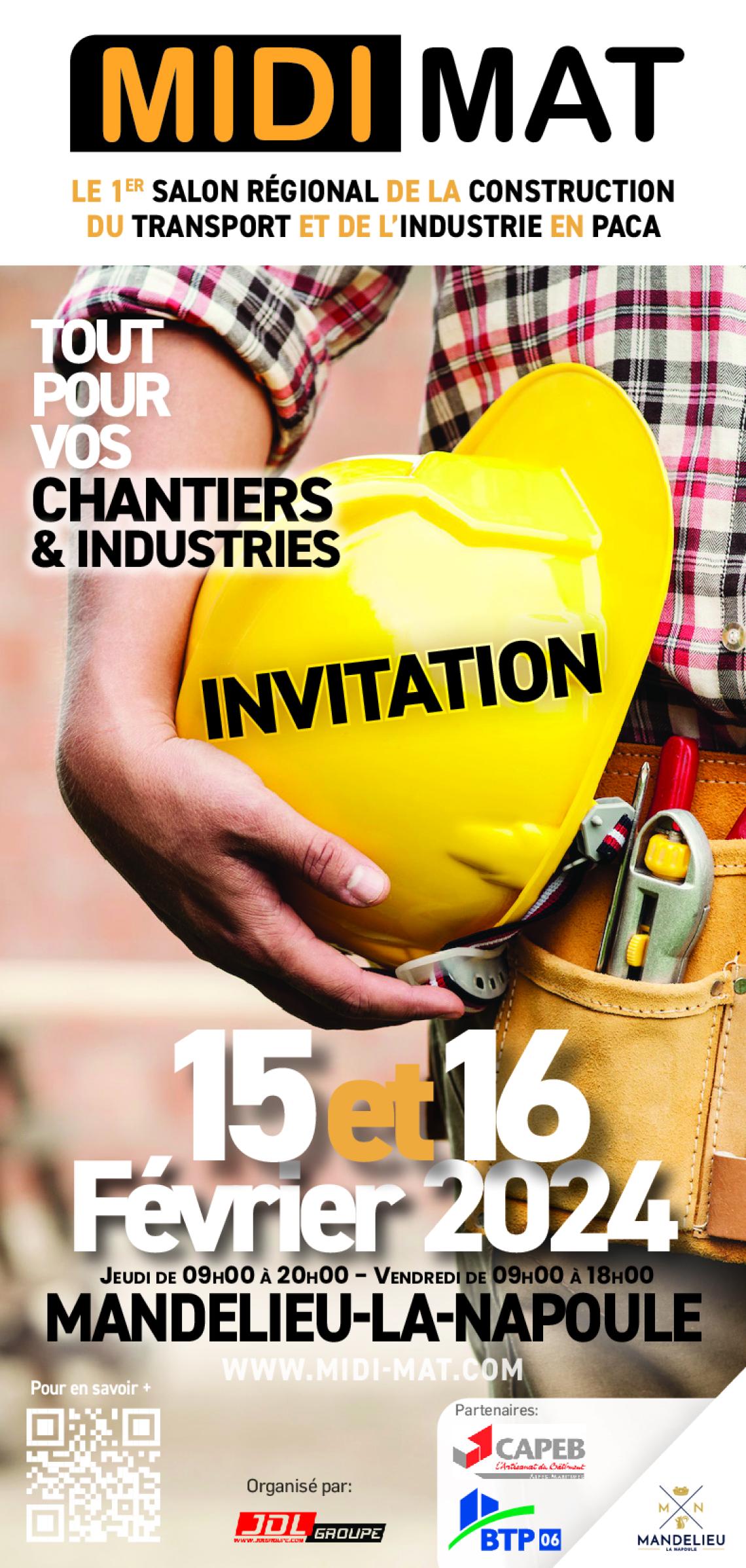 La CAPEB est partenaire du 1er salon MIDI MAT (de la construction du transport et de l’industrie) qui aura lieu au Parc Expo Congrès de Mandelieu La Napoule les 15 et 16 février.