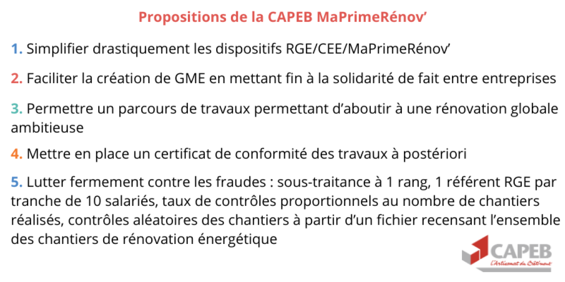 La CAPEB a formulé à maintes reprises des propositions simples et concrètes pour accélérer la réalisation de ces travaux, notamment en permettant à un plus grand nombre d’entreprises d’y contribuer. Or, non seulement ces propositions n’ont pas été reprises, mais la réforme annoncée de MaPrimeRénov’ suit des chemins inverses !