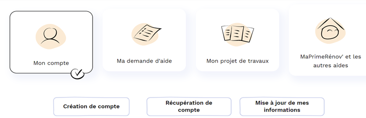 Quatre choix s’affichent alors : Mon compte / Ma demande d’aide / Mon projet de travaux / MaPrimeRénov et les autres aides.