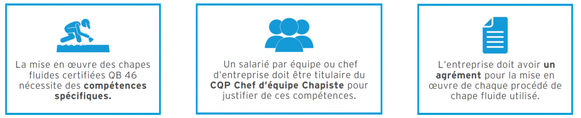 Pour répondre à la demande croissante des professionnels en matière de coulage de chape fluide, la CAPEB – les métiers Maçonnerie & Carrelage (MC) et l’UNECP-FFB ont créé le CQP Chef d’équipe chapiste, délivré par les Commissions paritaires nationales de l’emploi (CPNE) conjointes du BTP. Il devient obligatoire dans les entreprises à partir du 1er août 2024, et se substitue aux formations chez les fabricants pour tout type de chape fluide disposant de la certification QB 46.