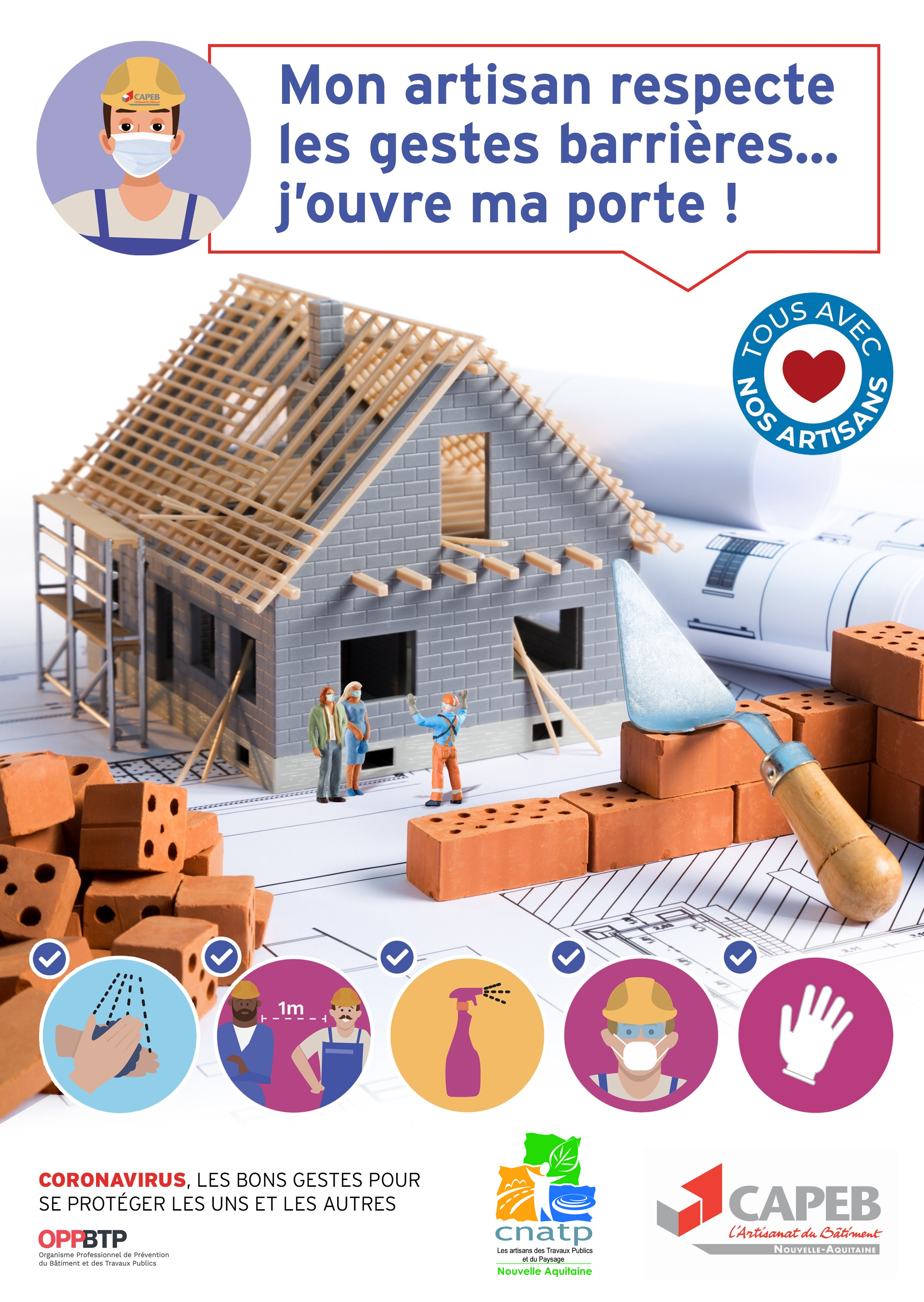 Pour vous aider, la CAPEB et la CNATP vous proposent de communiquer collectivement sur le slogan "mon artisan respecte les gestes barrières : j'ouvre ma porte" et de vous appuyer sur des affiches en téléchargement.