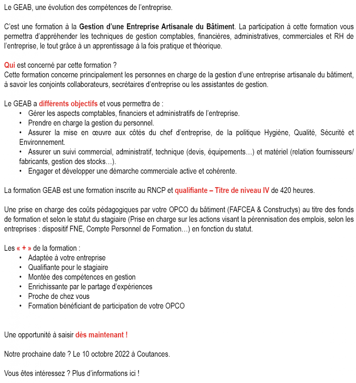 2022-09-07 00:00:00 GEAB - Développer les connaissances et compétences de votre entreprise https://offres.maformationbatiment.fr/geab/