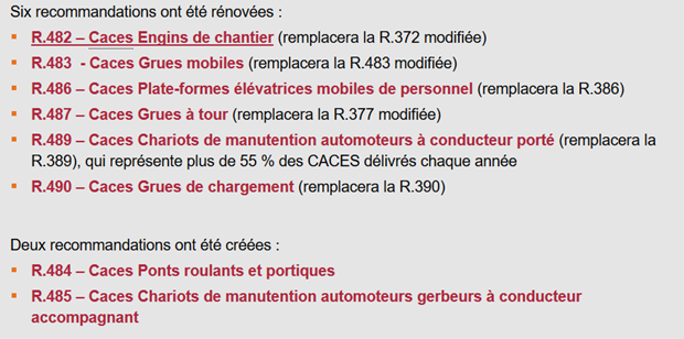 Les employeurs ne devront pas envoyer tous leurs salariés en formation dès janvier2020. Au 1er janvier 2020, la validité d'un CACES® est définie dans le nouveau référentiel de l'engin concerné au travers des règles de correspondances. Le principe est qu'un CACES® obtenu sur la base d'un référentiel actuel reste valable, jusqu'à la fin de sa période de validité de 5 ans, pour l'engin concerné. Les CACES® qui nécessitent une réactualisation tous les 10 ans, (les engins de chantier), devront être renouvelés, au plus tard, 5 ans après la mise en œuvre des nouveaux référentiels. En conséquence, un salarié ayant passé un CACES R372m en 2019,devra passer un CACES® R482 en janvier 2025, au plus tard.