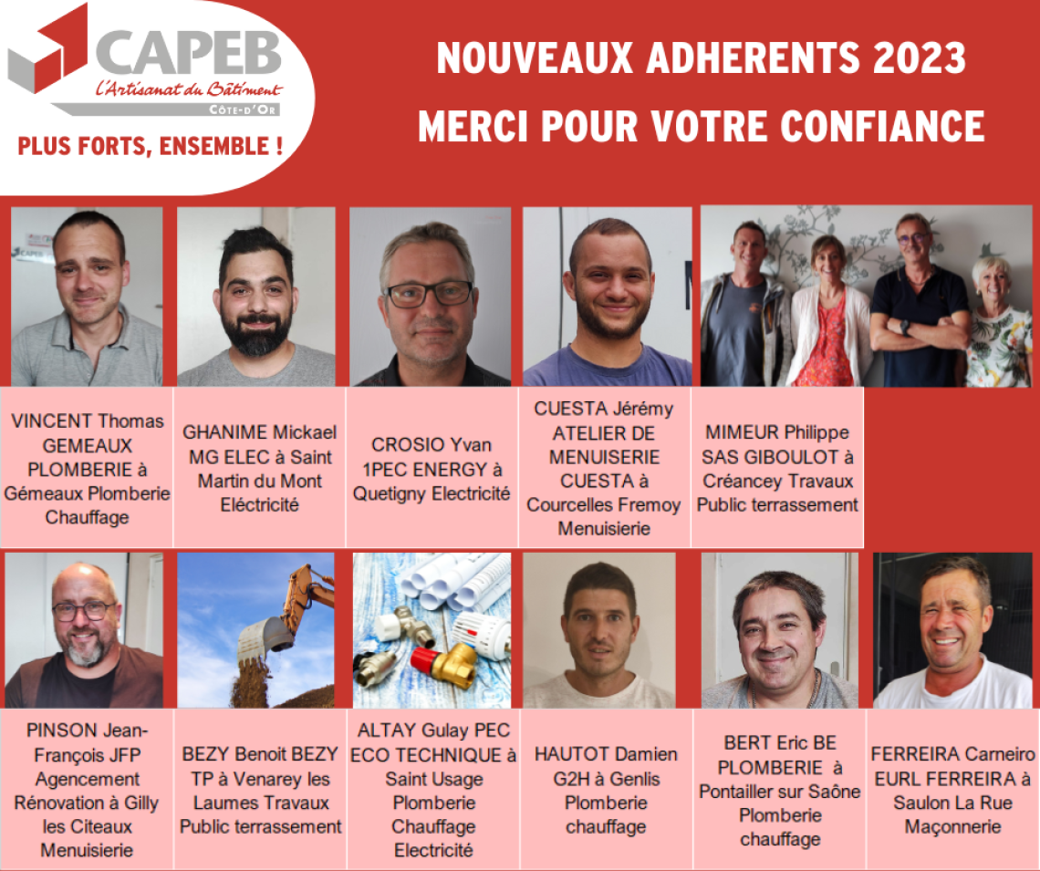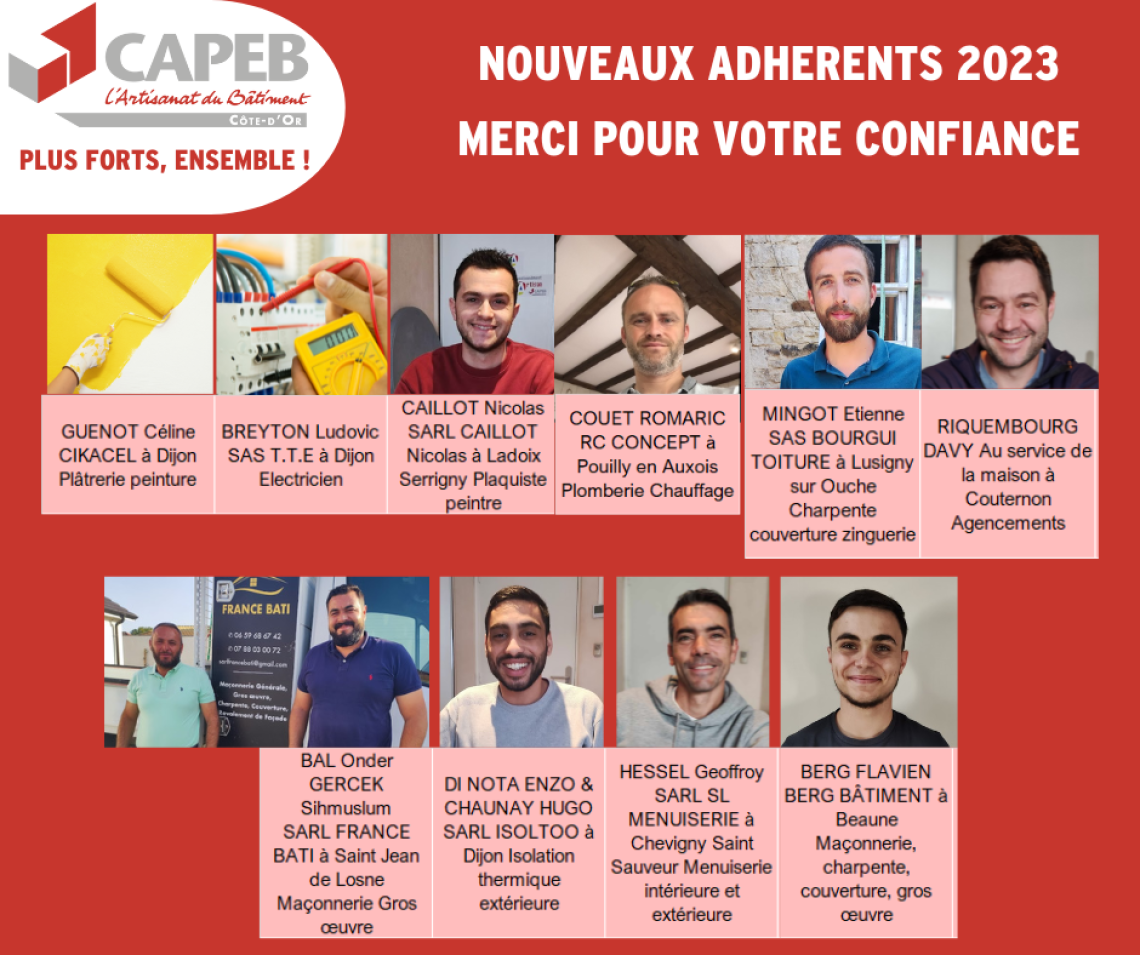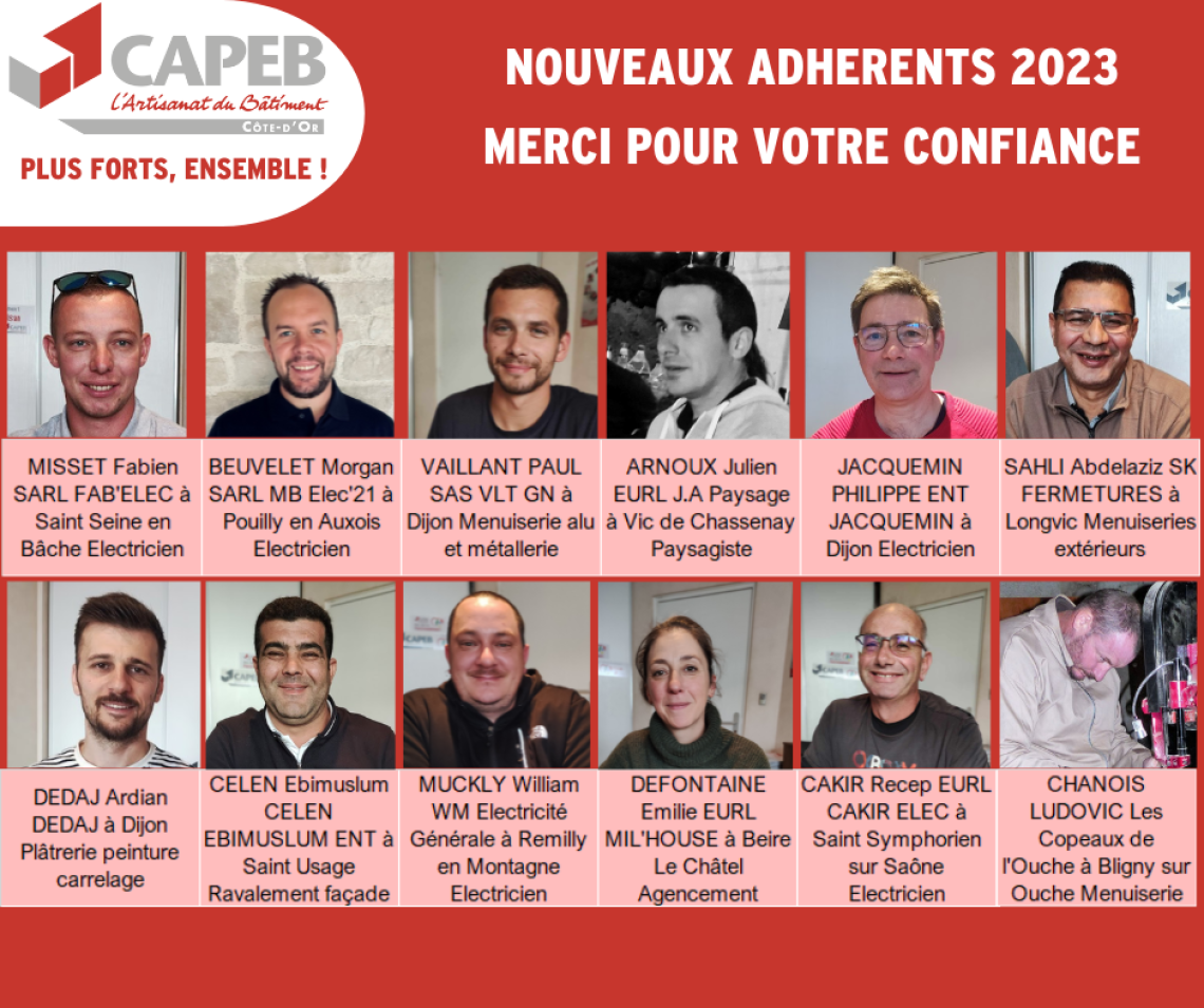 Bienvenue à nos nouveaux adhérents qui ont rejoint la CAPEB 21 ces derniers mois pour se faire Conseiller, Accompagner et Défendre.