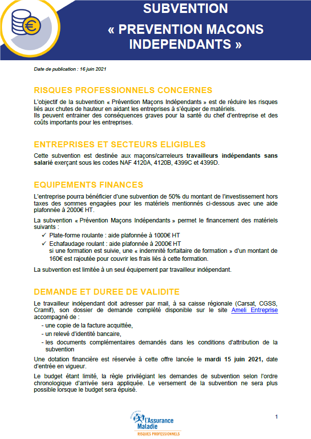 Depuis le 15 juin 2021, l’Assurance Maladie - Risques professionnels propose la subvention « Prévention Maçons Indépendants » pour aider les travailleurs indépendants maçons sans salarié à prévenir les risques liés à leur activité professionnelle, et plus particulièrement le risque de chute de hauteur