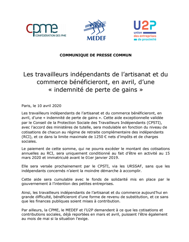 L'U2P (Union des Professionnels de Proximité) dont est membre la CAPEB, la CPME et le MEDEF annoncent dans un communiqué de presse commun que les indépendants de l’artisanat et du commerce bénéficieront, en avril, d’une « indemnité de perte de gains » versée par le CPSTI via les URSSAF.