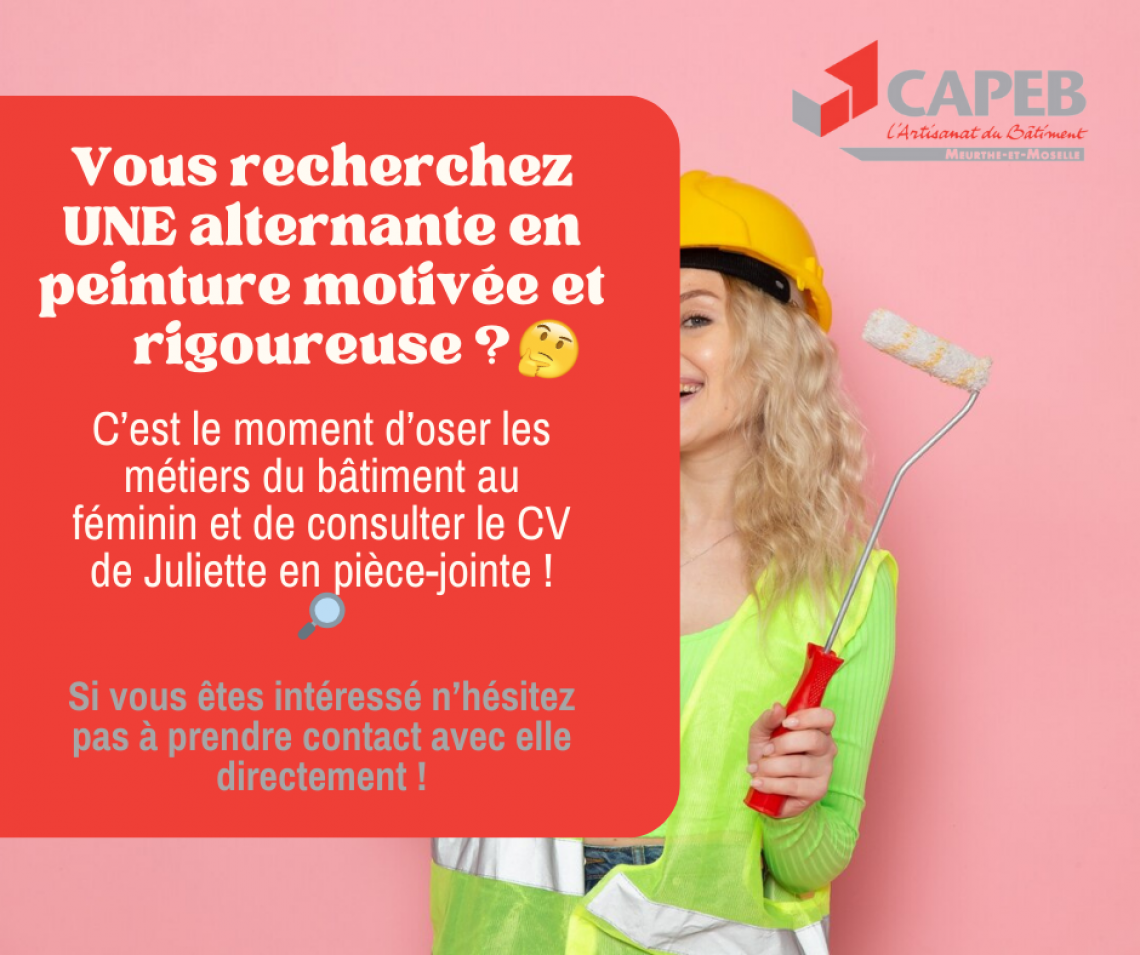 La CAPEB Meurthe-et-Moselle profite de cette belle journée de rentrée pour partager la candidature d’une jeune fille très motivée pour une alternance en peinture !