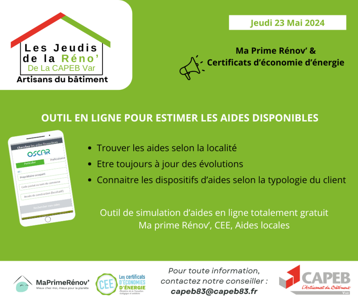 2024-05-23 10:24:11 Outil en ligne pour estimer les aides disponibles : OSCAR Pour plus d'infos, contactez Eric Lemarchand au 04.94.14.72.62