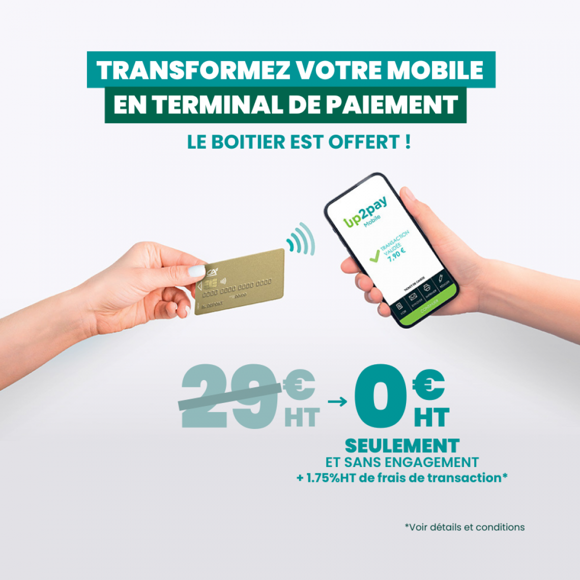 Pour toute 1ère souscription et au 1er boitier UP2PAY mobile à Lecteur offert soit une économie de 29 € (offre avec lecteur ou offre lecteur + 100% Mobile)