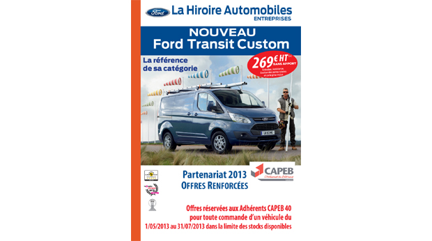 La société La Hiroire Automobiles propose à nouveau aux adhérents CAPEB des offres renforcées sur l’ensemble de la gamme FORD utilitaires et véhicules de tourisme.