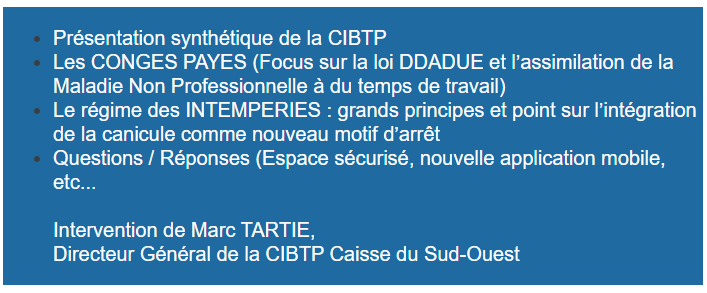 PARTICIPEZ A NOTRE REUNION A LA CIBTP : LES CONGES PAYES, LE REGIME INTEMPERIES, LE NOUVEL ESPACE SECURISE
