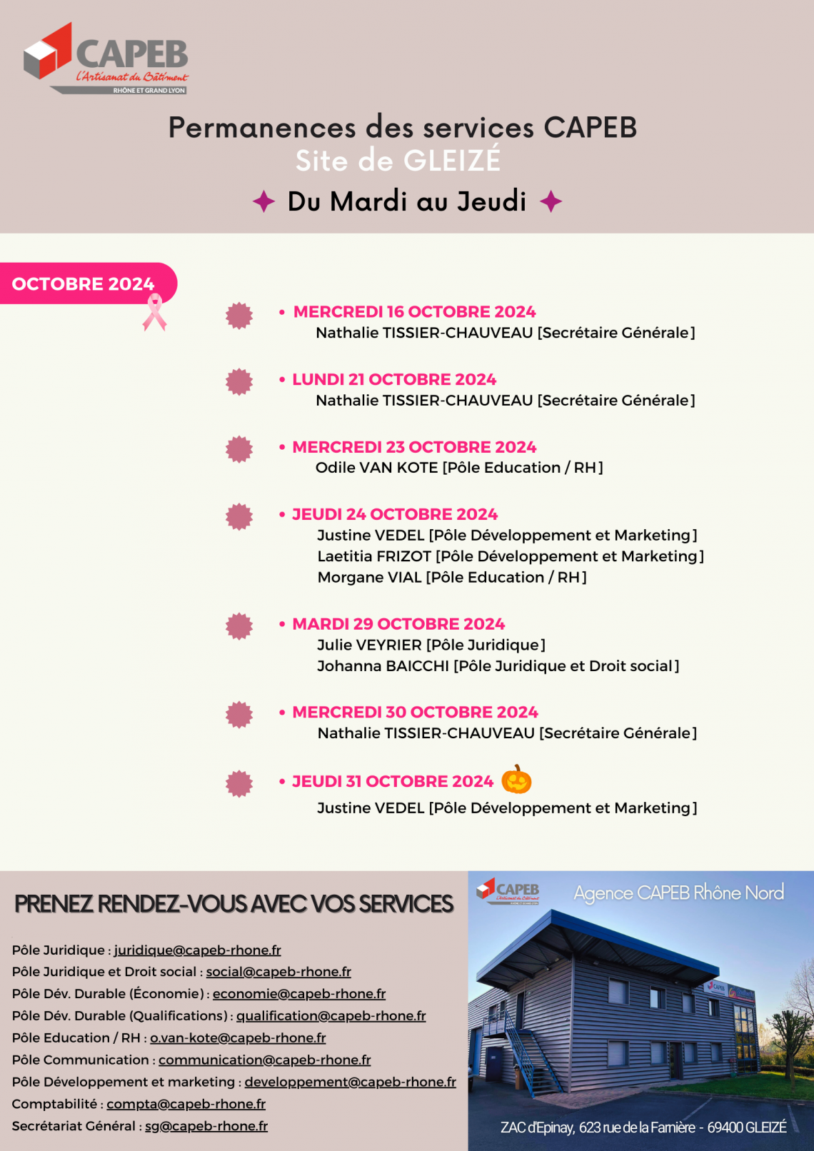 Retrouvez les permanences des différents pôles de la CAPEB RHONE ET GRAND LYON, sur le site de Gleizé, du mardi au jeudi.