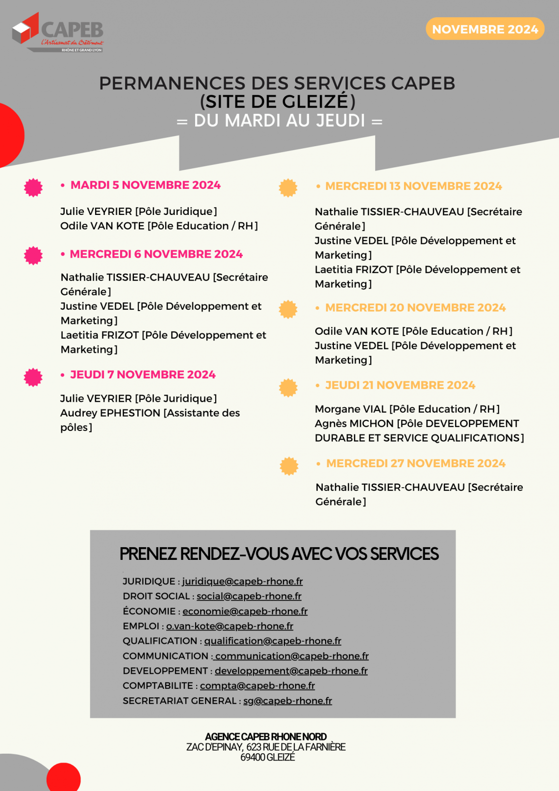 Retrouvez les permanences des différents pôles de la CAPEB RHONE ET GRAND LYON, sur le site de Gleizé, du mardi au jeudi.