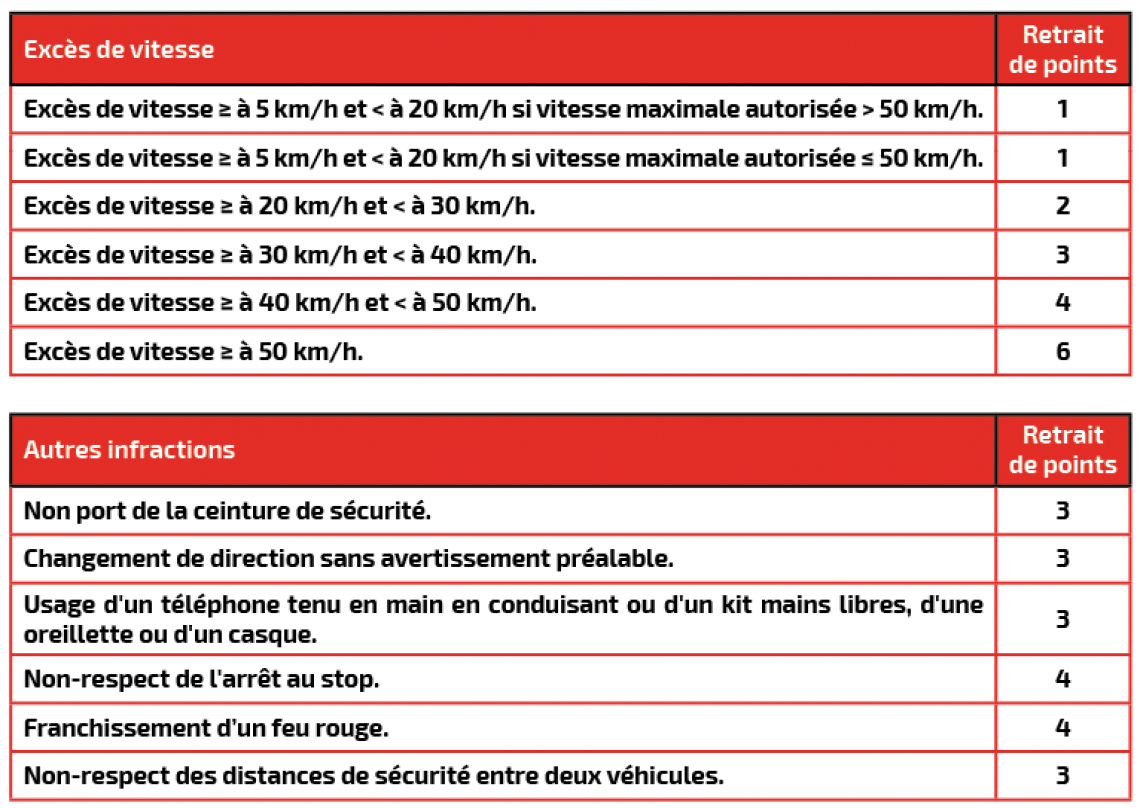 Le système du permis à points s'applique à tous les permis de conduire. Des points peuvent être retirés si vous ne respectez pas le code de la route. Selon la gravité de l'infraction le nombre de points retirés varie de 1 à 6. Nous vous indiquons le nombre de points retirés pour les principales infractions routières