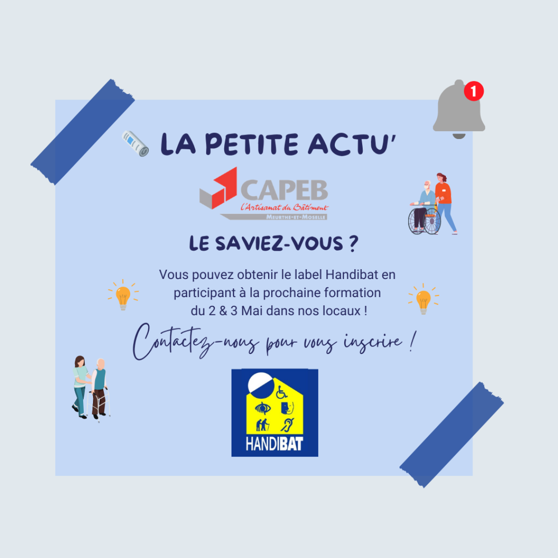 PETITE ACTU': Inscrivez vous à la formation Handibat les 2 & 3 Mai !