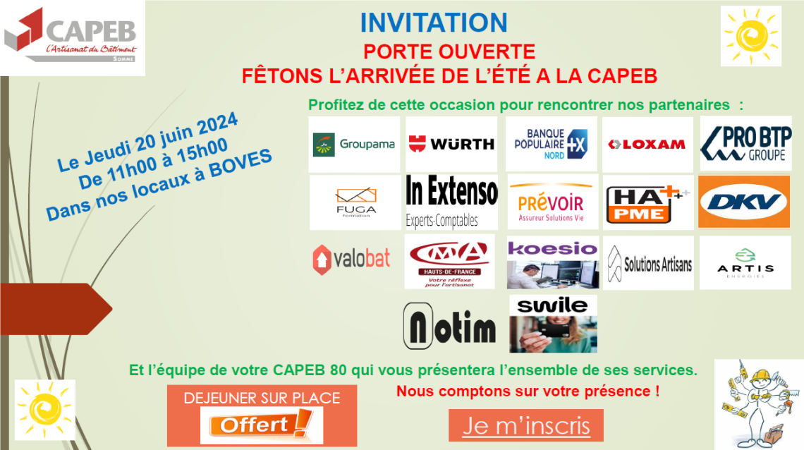 2024-05-23 12:00:00 PORTE OUVERTE, FÊTONS L’ARRIVÉE DE L’ÉTÉ A LA CAPEB Le Jeudi 20 juin 2024 de 11h00 à 15h00 Dans nos locaux à BOVES Je m'inscris Je télécharge l'invitation