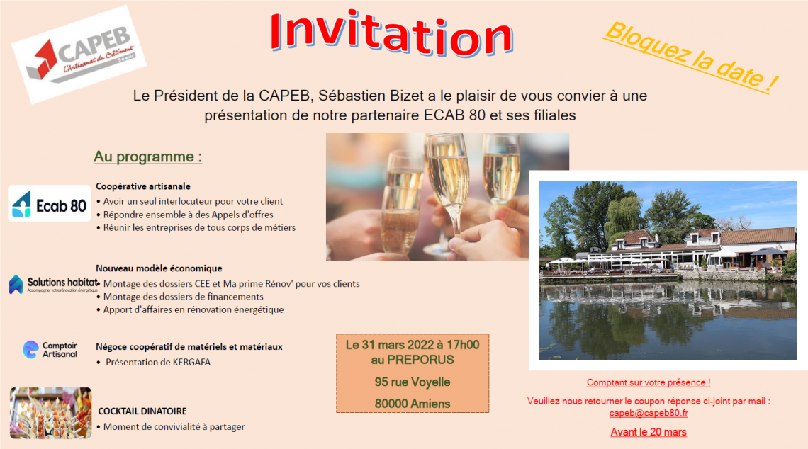 2022-03-23 12:00:00 PRESENTATION DES NOUVEAUX PARTENAIRES CAPEB Le 31 Mars 2022 à 17h au Préporus (Amiens) Montage des dossiers CEE, MAPRIMERENOV Téléchargez le bulletin d'inscription ici