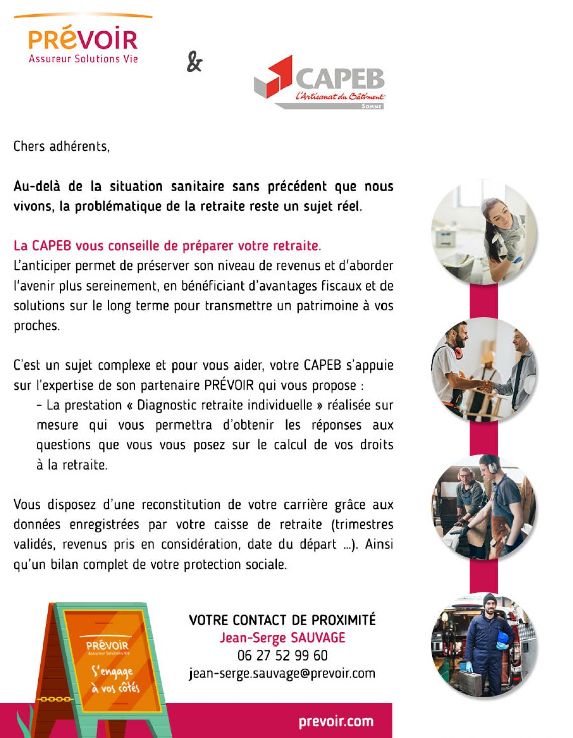 Vous souhaitez un rendez-vous avec un conseiller pour un bilan retraite gratuit, contactez-nous au 0360127222 ou par mail d.maisonneuve@capeb80.fr ou M SAUVAGE de chez PREVOIR au 06 27 52 99 60