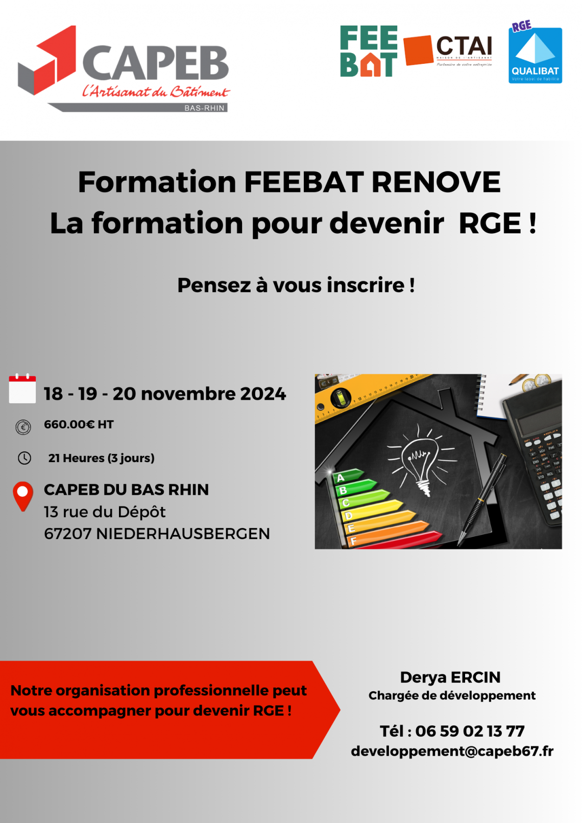 La prochaine Formation FEEBAT RENOVE : la formation pour devenir RGE, aura lieu à la CAPEB du Bas-Rhin - 13 Rue du Dépôt 67207 NIEDERHAUSBERGEN du 18 au 20 novembre 2024.