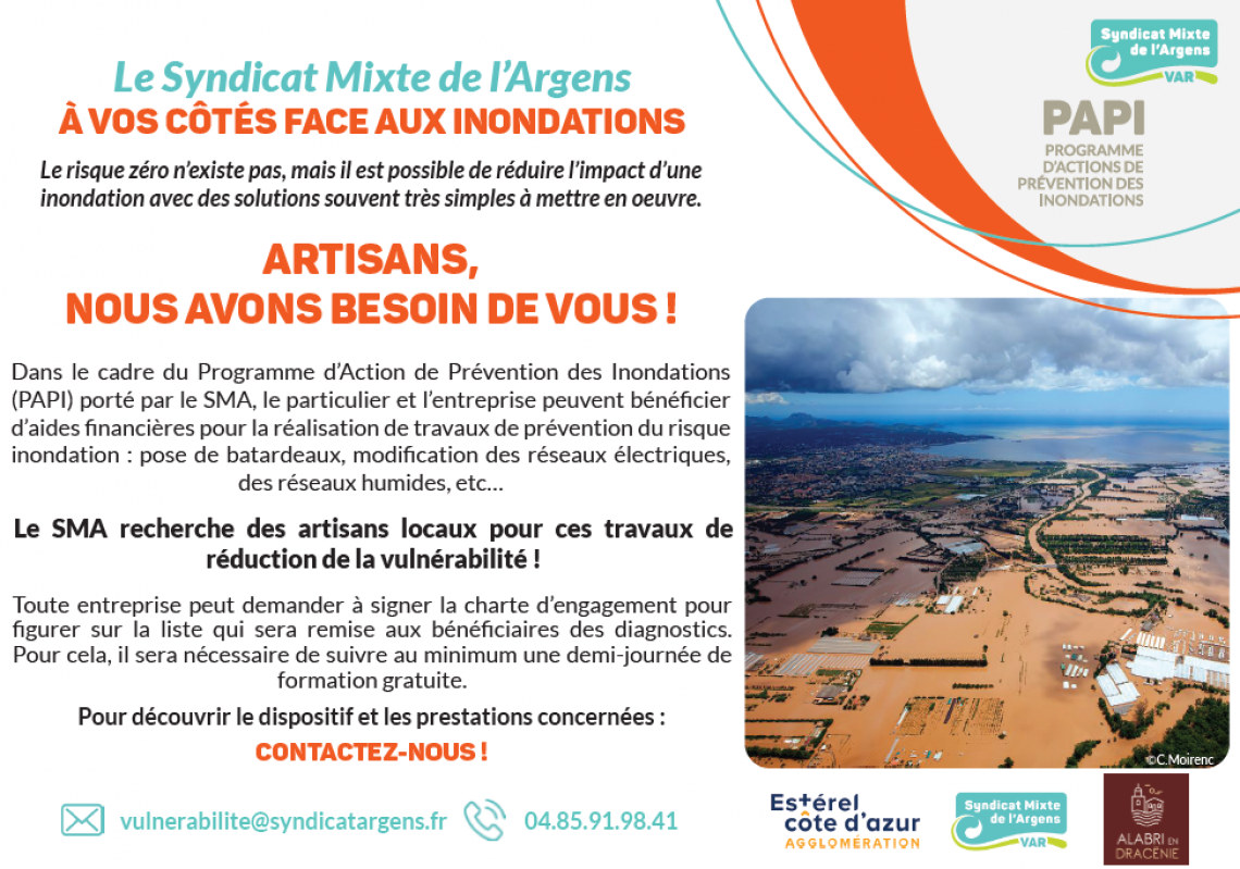 Dans le cadre du Programme d’Actions de Prévention des Inondations (PAPI) « Argens et côtiers de l’Estérel », une large démarche de réduction de vulnérabilité des activités économiques et des habitations est déployée sur l’ensemble du territoire. Les dispositifs mis en œuvre par les agglomérations Dracénie Provence Verdon et Estérel Côte d'Azur et par le Syndicat Mixte de l’Argens permettent aux professionnels et aux particuliers d’accéder à un diagnostic gratuit de leur bien et à un accompagnement aux démarches administratives pour l’obtention de subvention à la réalisation de leurs travaux de protection.