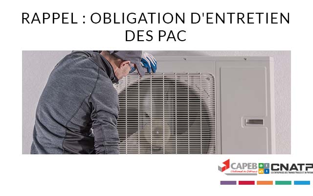 Ainsi, les PAC déjà installées devront toutes avoir été contrôlées avant le 1er juillet 2022 et les PAC neuves devront l'être dans les deux ans qui suivront leur installation. L'Association Française pour les Pompes à chaleur (AFPAC) a publié à cet effet, [une attestation d'entretien pompe à chaleur](https://www.capeb.fr/www/capeb/media//aube/document/Attestation%20d’entretien%20pompe%20à%20chaleur%20-%20Afpac%20(1).pdf)que nous mettons à votre disposition.