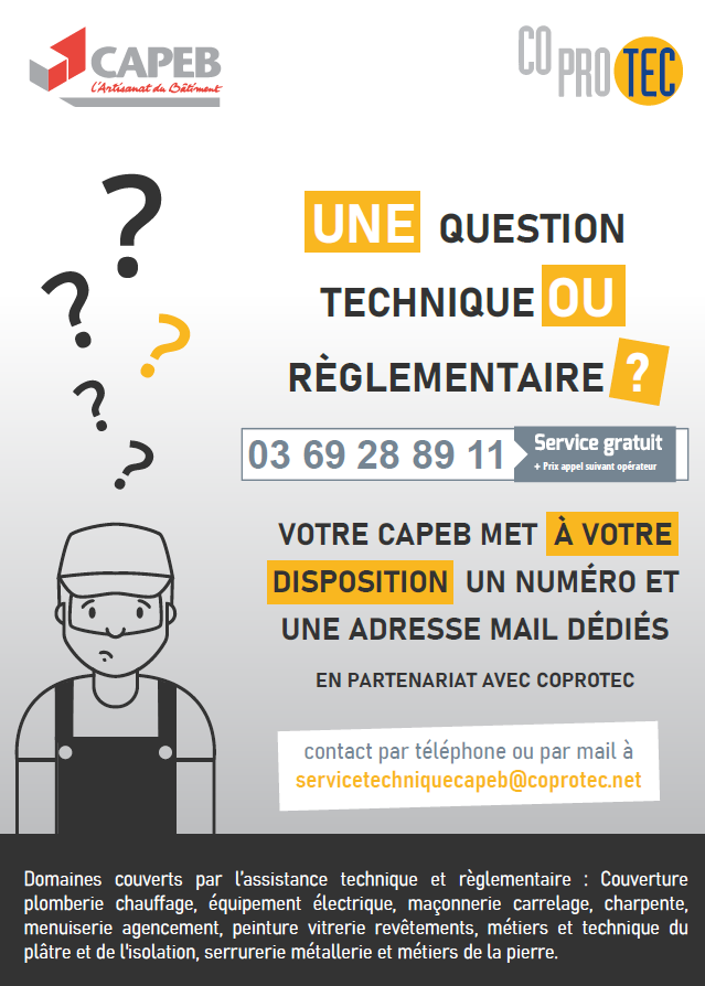 Pour toutes questions d’ordre technique ou règlementaire sur l’ensemble des corps d’états du bâtiment, vous pouvez contacter notre service technique COPROTEC au numéro suivant : 03 69 28 89 11 ou par mail à l’adresse suivante : servicetechniquecapeb@coprotec.net