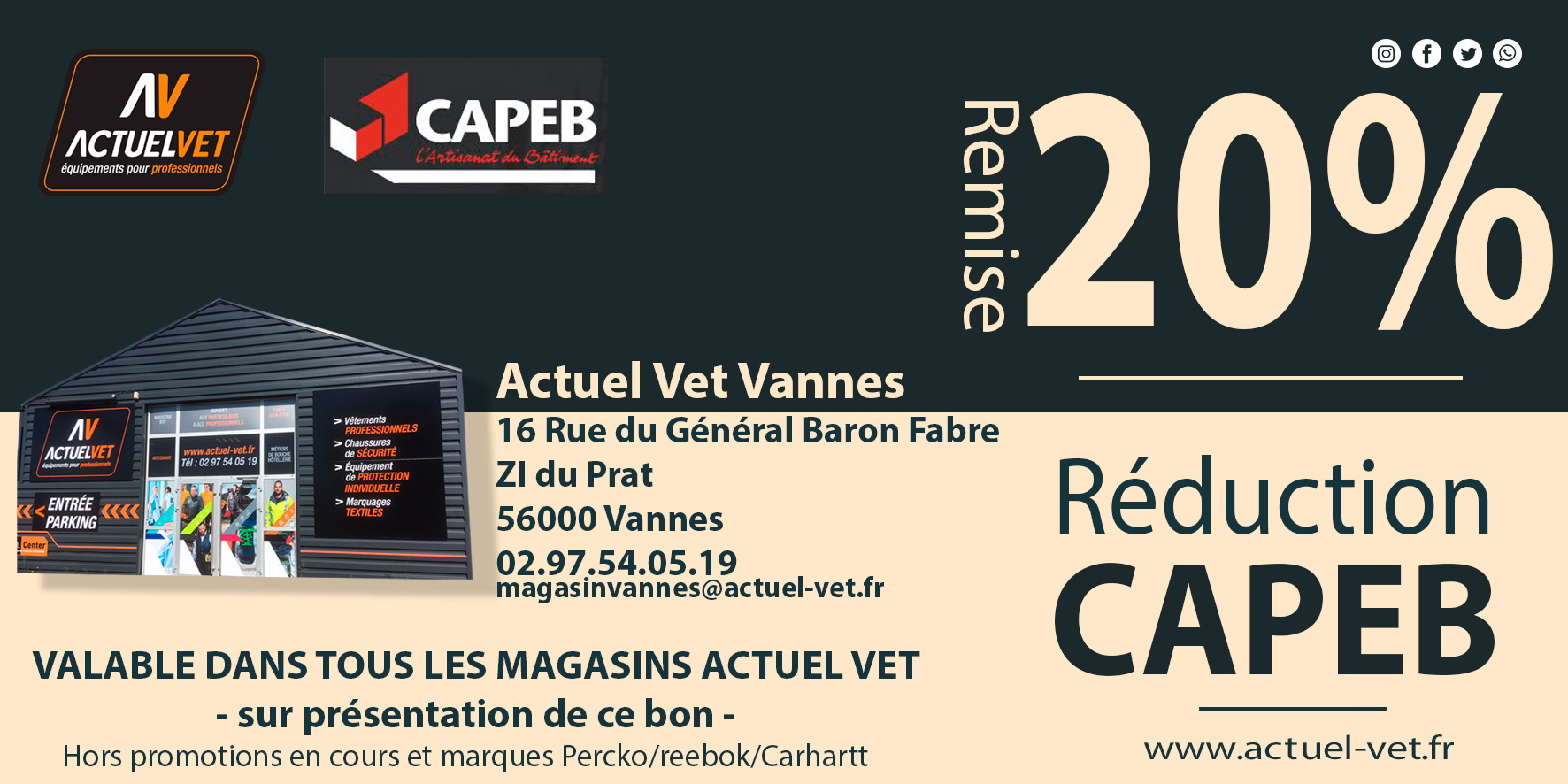 En tant qu'adhérent CAPEB profitez d'une remise de 20% sur l'ensemble du magasin Actuel Vet situé à Vannes.