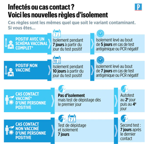 o si ce dernier est positif ou si vous n’avez pas réalisé de test, vous devez poursuivre votre isolement jusqu’au 10e jour après la date du début des symptômes ou la date de prélèvement du test positif si vous n’avez pas de symptômes. Il n’est pas nécessaire de réaliser un nouveau test au 10e jour.