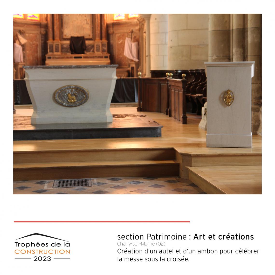 Le projet était : Création d'un autel et d'un ambon pour célébrer la messe sous la croisée. L'autel et l'ambon sont composés de pierre de bourgogne de marbre belge et le socle en pierre bleue du Hainaut pour se rapprocher au plus des matériaux utilisés sur l'autel d'origine dans le cœur.