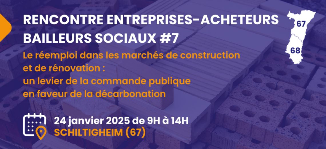 La 7ème édition des rencontres entre entreprises et acheteurs des bailleurs sociaux sur le thème du réemploi dans les marchés publics aura lieu le vendredi 24 janvier 2025 de 09h00 à 14h00 à la Chambre de Métiers d’Alsace à Schiltigheim (30 avenue de l’Europe – 67300 SCHILTIGHEIM).