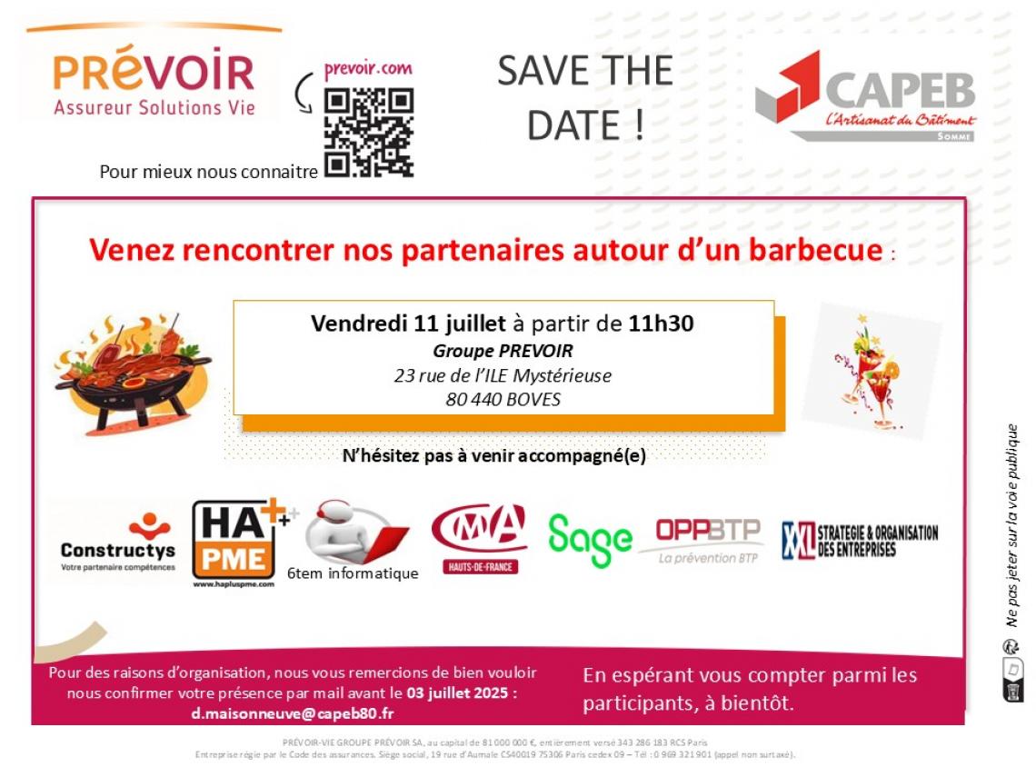 2025-07-07 17:00:00 RENCONTREZ NOS PARTENAIRES AUTOUR D'UN BARBECUE LE 11 JUILLET A 12H CHEZ PREVOIR Lien d'inscription ici
