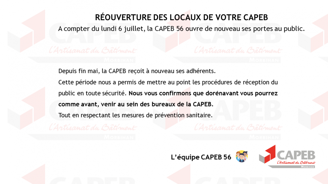 2020-06-29 02:32:00 RÉOUVERTURE DES LOCAUX DE VOTRE CAPEB A compter du lundi 6 juillet, la CAPEB 56 ouvre de nouveau ses portes au public.