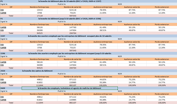 En effet, les données initialement transmises par les organisations professionnelles candidates, en l’occurrence la CAPEB et la FFB, ont été certifiées par des Commissaires aux Comptes et reposaient exclusivement sur les périmètres historiques conformément aux règles en vigueur à ce moment-là. Or, aucune procédure de contrôle équivalente n’a été appliquée pour les résultats extrapolés sur les périmètres catégoriels. Ainsi, certains résultats publiés font apparaître des chiffres strictement identiques pour les conventions cadres et ETAM, tant en nombre d’entreprises qu’en nombre de salariés, ce qui est statistiquement impossible.