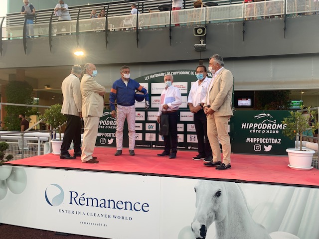 Remise du prix à Pierre Vercruysse, vainqueur de la course, par Sylvain Locci, Président de la CAPEB 06, en présence de Louis Nègre, Maire de Cagnes-sur-Mer, Joseph Segura, Maire de Saint Laurent-du-Var, François Forcioli-Conti, Président de la Société des Courses de la Côte d'Azur et Patrick Tosello, administrateur CAPEB 06 et 1er adjoint au maire d'Amirat.