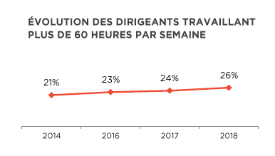 L’année 2018 marque une nouvelle intensification des rythmes de travail hebdomadaire des dirigeants : 65 % des artisans travaillent plus de 50 heures par semaine (63 % en 2017) et 26 % plus de 60 heures (24 % en 2017).