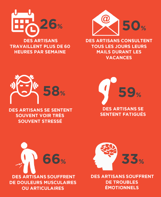 Les chefs d’entreprise artisanale n’ont jamais été aussi préoccupés : 58 % se disent stressés, et ce stress s’intensifie (+15 points en un an). En cause, le poids des démarches administratives, la charge de travail, les contraintes de délais et le manque de repos. Ce stress, qui impacte la qualité de sommeil des artisans, les expose à un risque accru d’épuisement professionnel. Ils sont ainsi 59 % à affirmer se sentir très fatigués (contre 56 % en 2016 et 58 % en 2017).