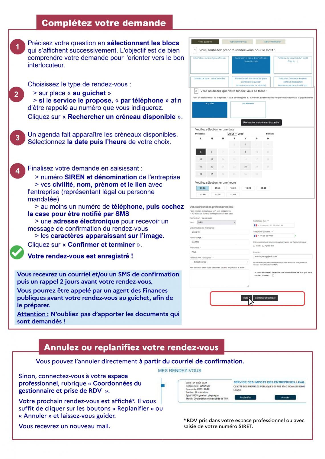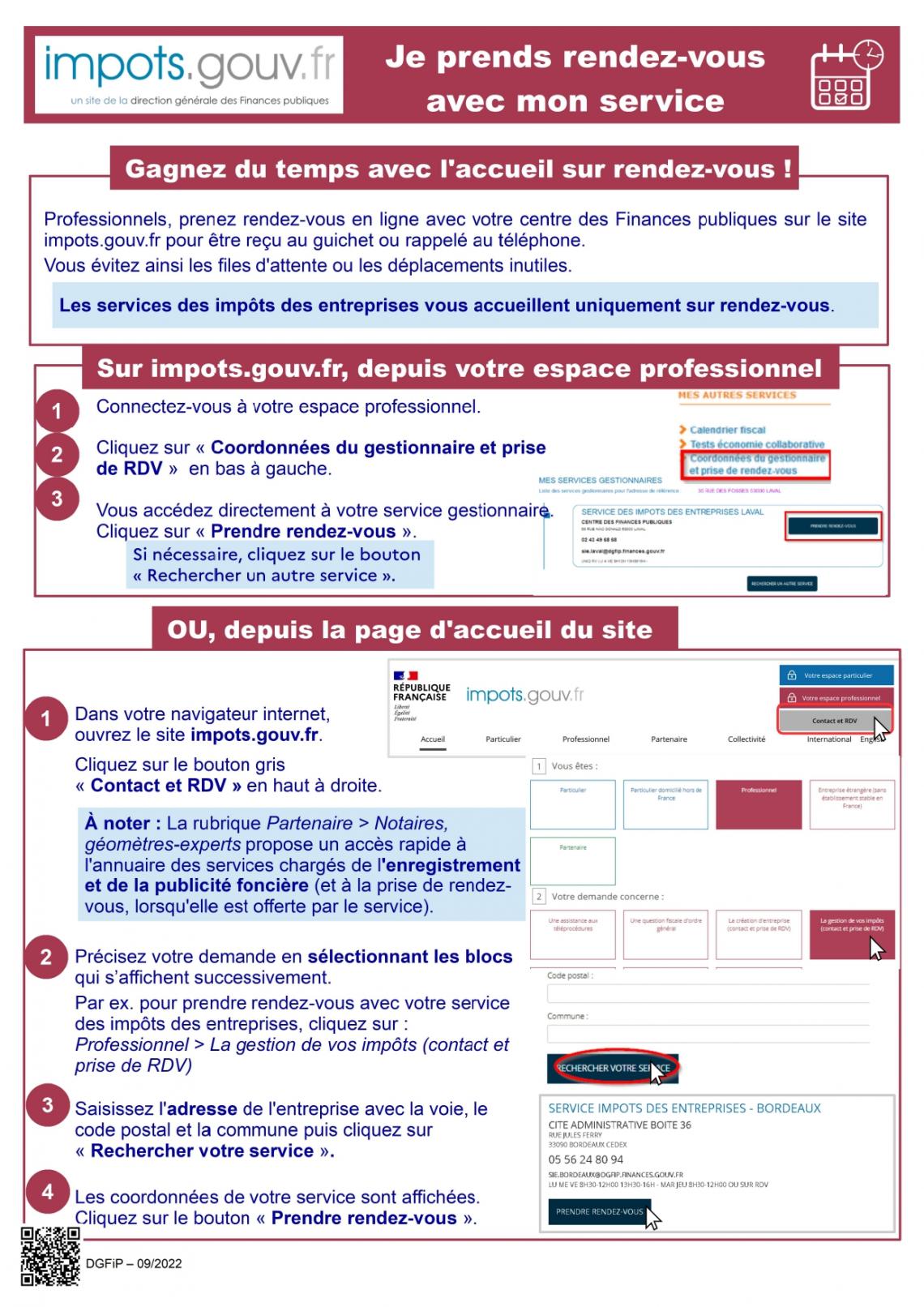 La prise de rendez-vous est possible depuis le site impots.gouv.fr dans la rubrique "contacts et RDV" ou depuis l'espace professionnel dans la rubrique "mes autres services - coordonnées du gestionnaire".