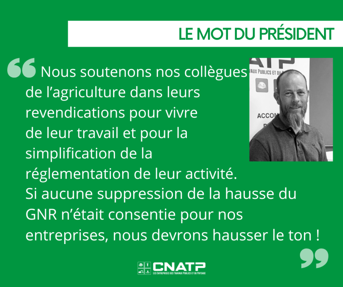 Néanmoins, la semaine dernière, ils ont obtenu la suppression de la hausse du GNR pour leur secteur. Cela aggrave la concurrence déloyale déjà actée pour nos entreprises notamment des travaux publics, du paysage, et du gros œuvre. Nous ne pouvons laisser passer cela. Grâce à nos premières actions, nous avons été reçus par Bercy et Matignon, et nous attendons d’ici demain soir des annonces pour notre secteur.