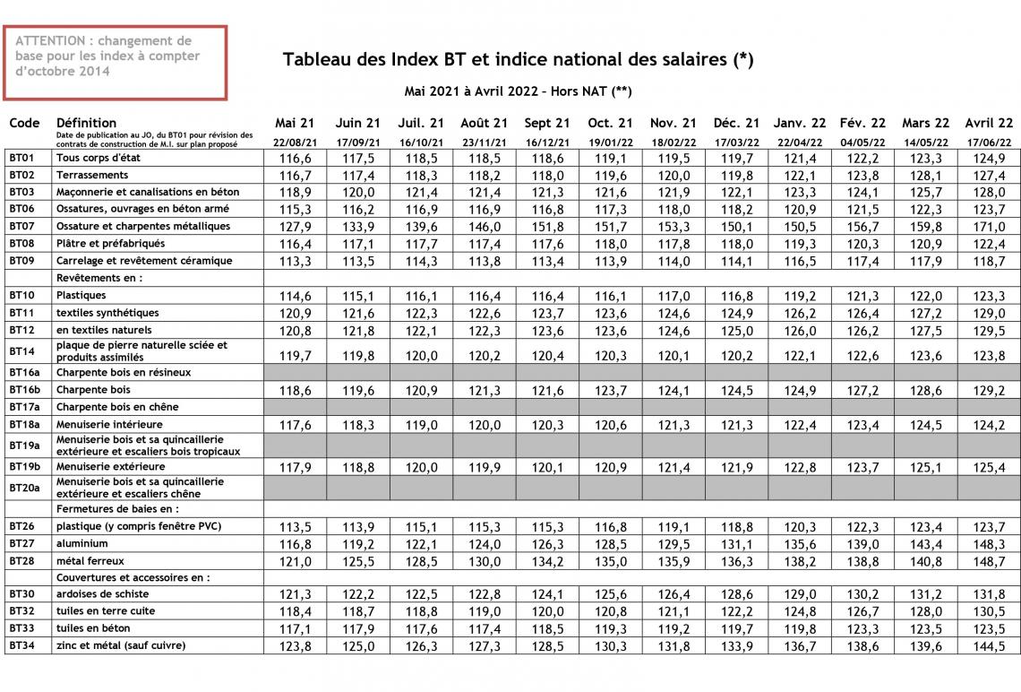 2022-08-05 00:00:00 Tableau des Index BT et indice national des salaires Télécharger les index BT d'avril 2022